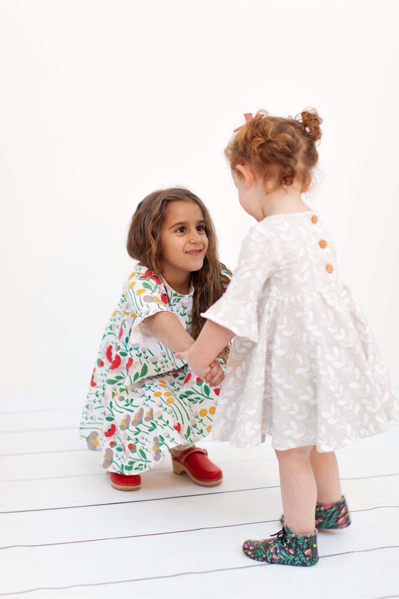 The sweetest little dress to twirl around the block and move mountains :) The frill sleeves,  boat neck and wooden button on the back make this soft, comfy dress even sweeter.
