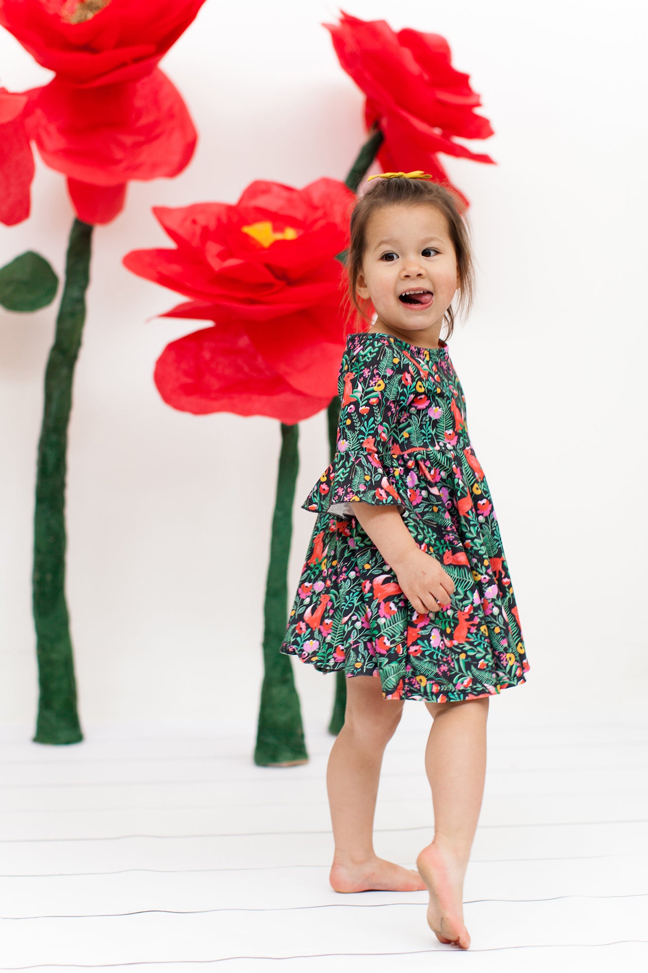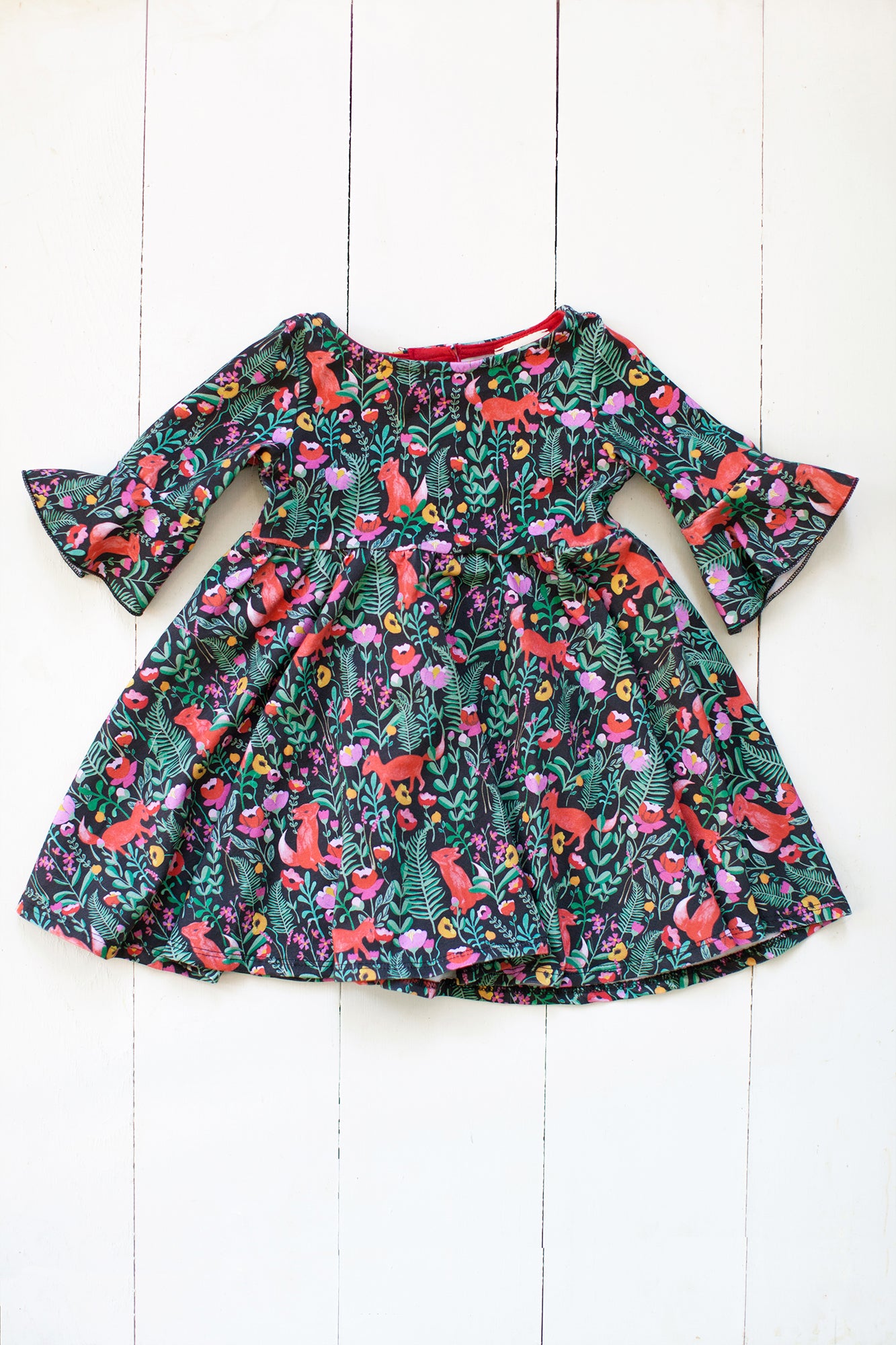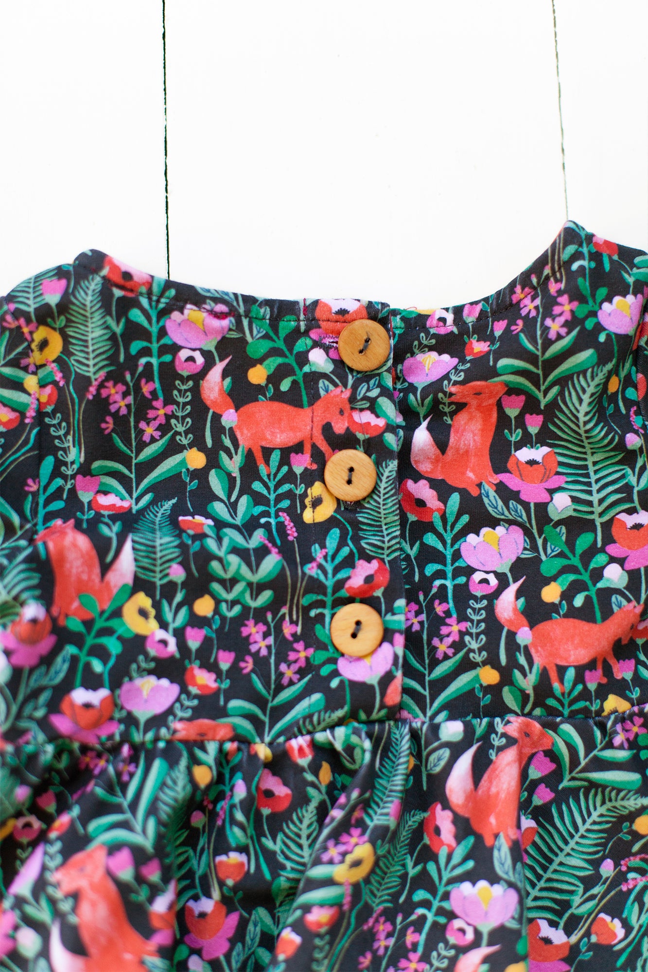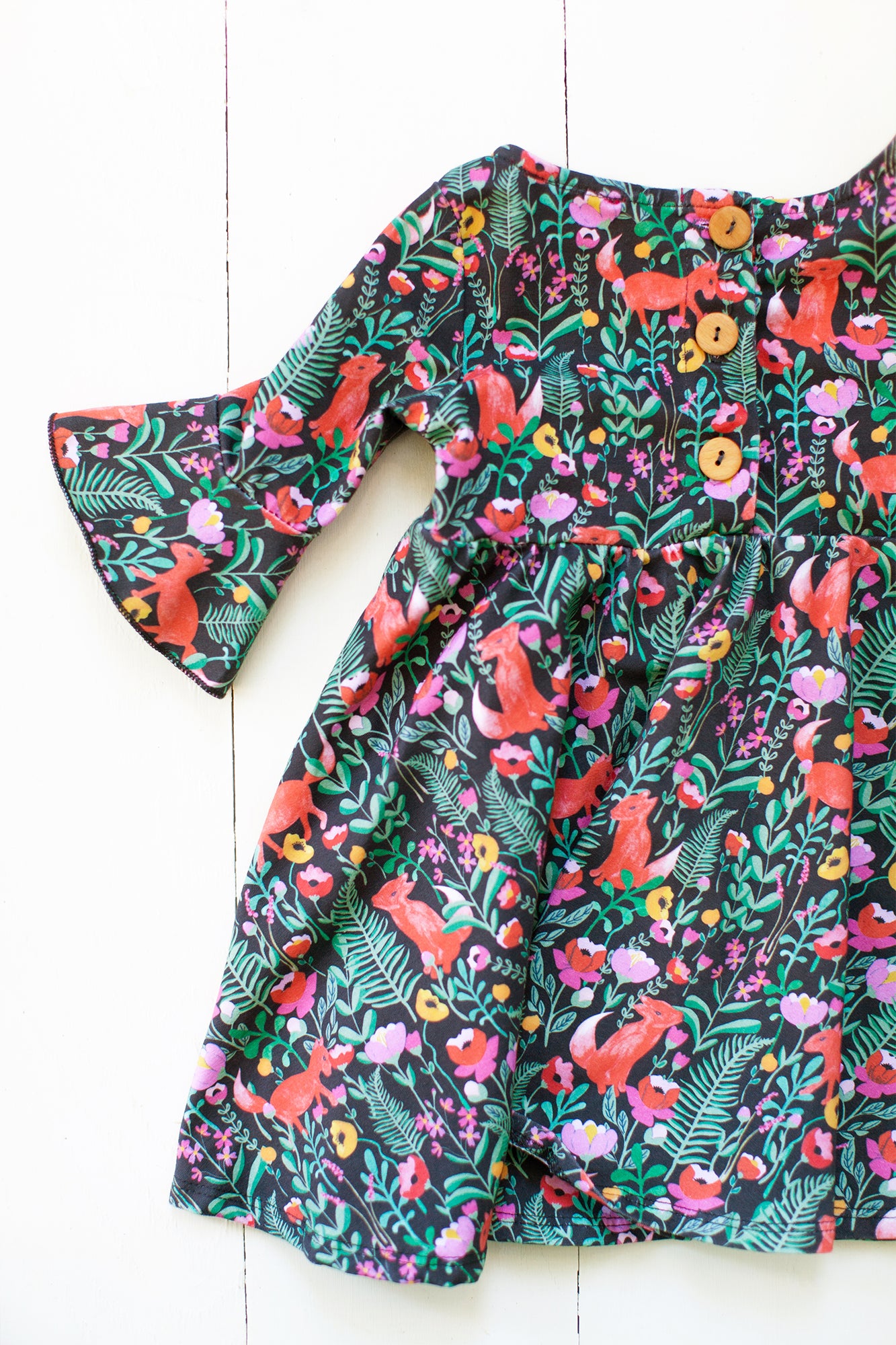 The sweetest little dress to twirl around the block and move mountains :) The frill sleeves, boat neck and wooden button on the back make this soft, comfy dress even sweeter.