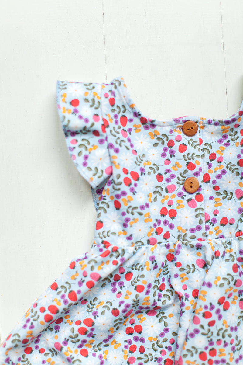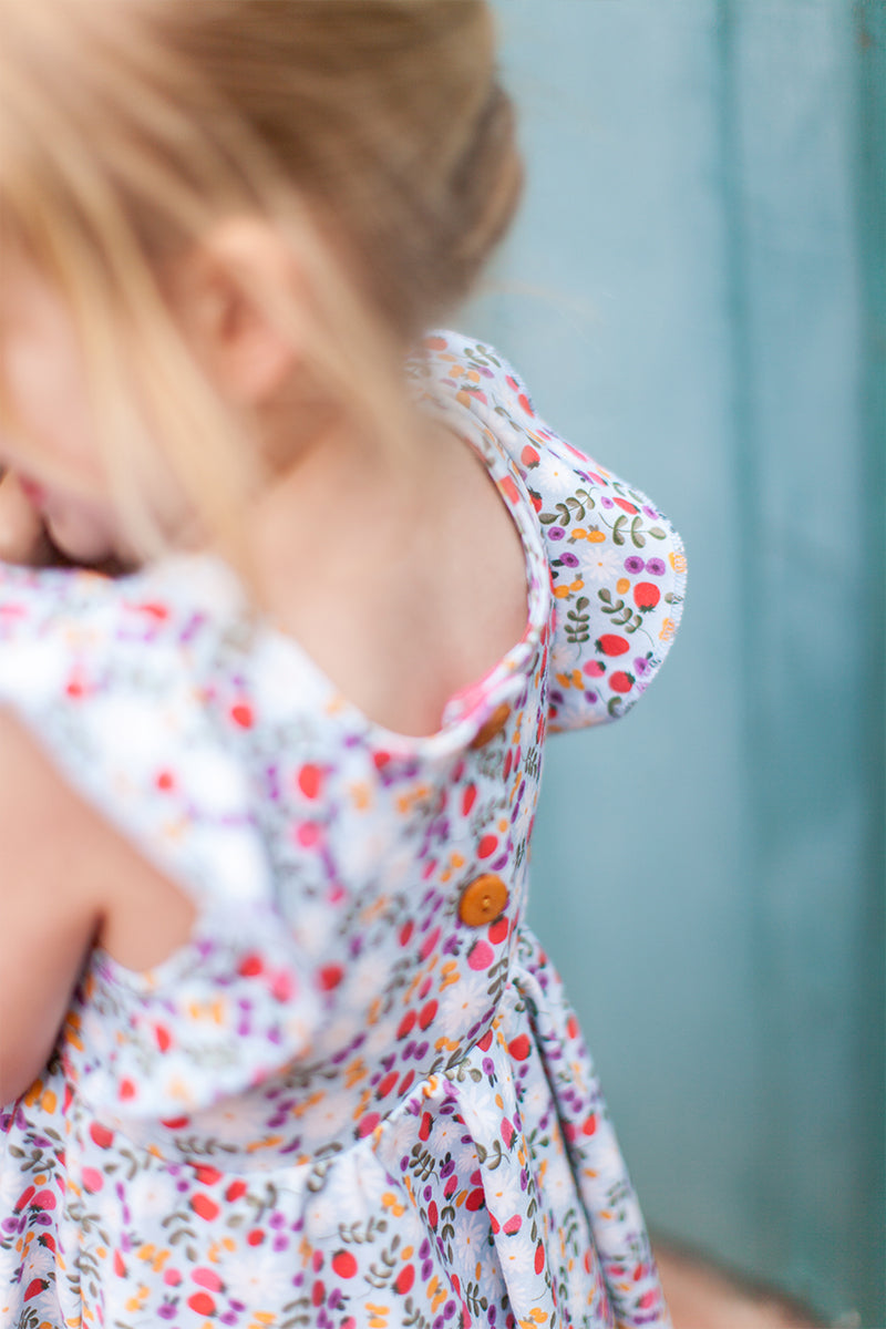The sweetest little dress to twirl around the block and move mountains - summer edition:) The ruffle cap sleeves & wooden button on the back make this soft, comfy dress even sweeter.