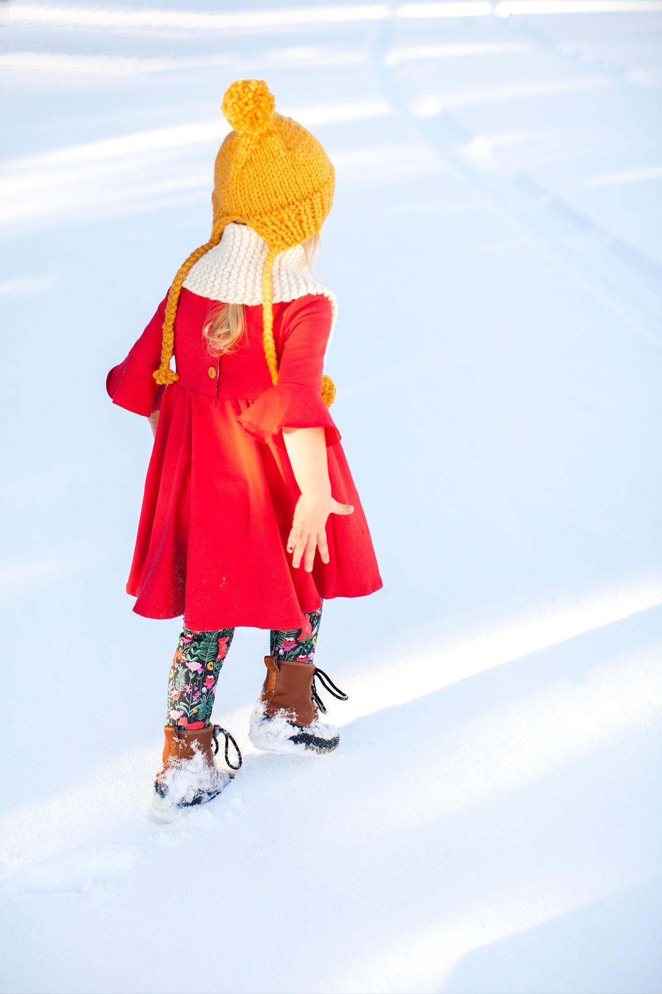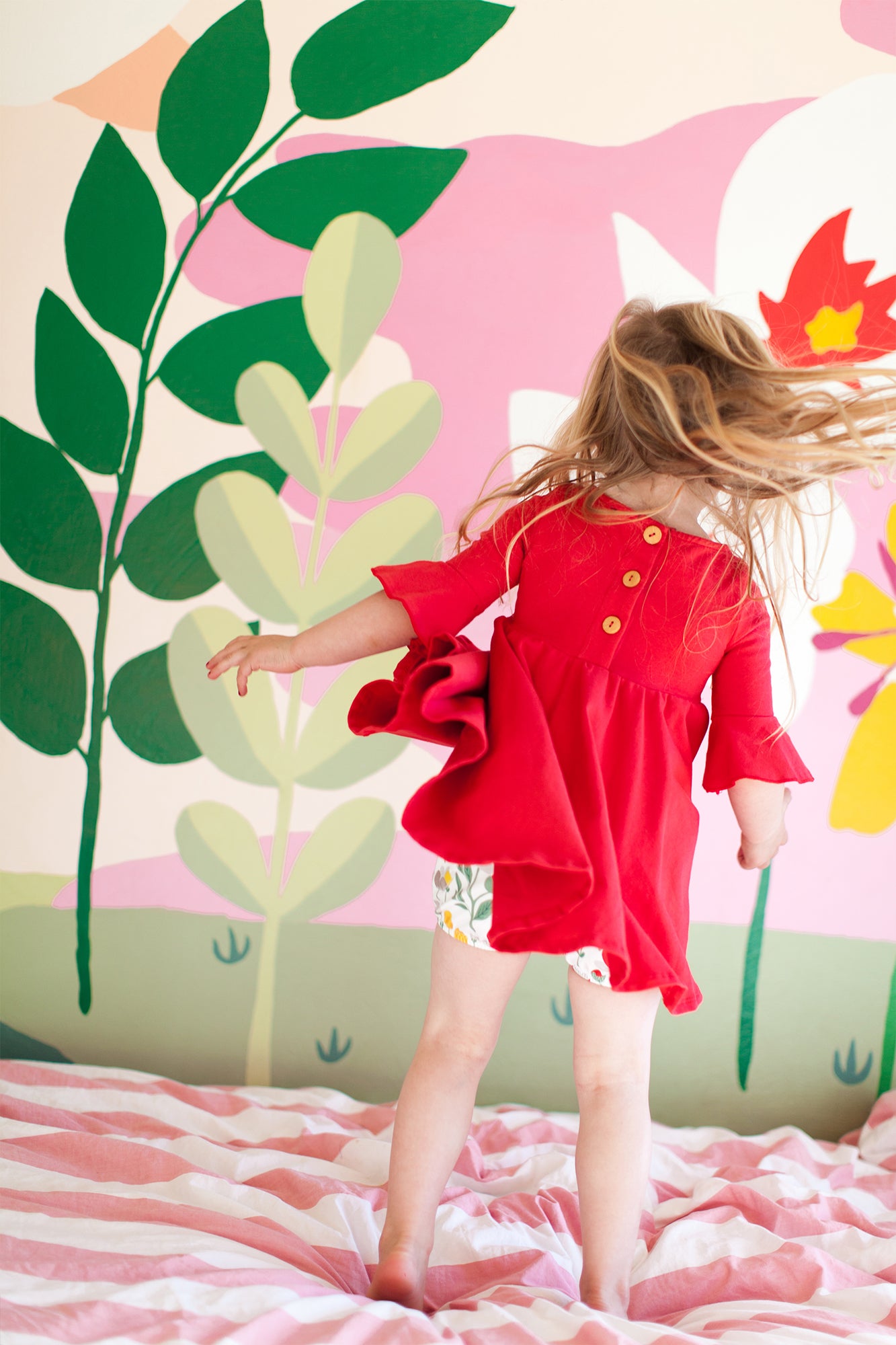 The sweetest little dress to twirl around the block and move mountains :) The frill sleeves, boat neck and wooden button on the back make this soft, comfy dress even sweeter.
